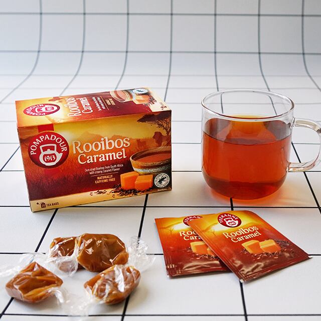 ポンパドールのルイボスティー キャラメルは、キャラメルのクリーミーでまろやかな香りが、渋みがなくすっきりとした味わいのルイボスティーにベストマッチ。