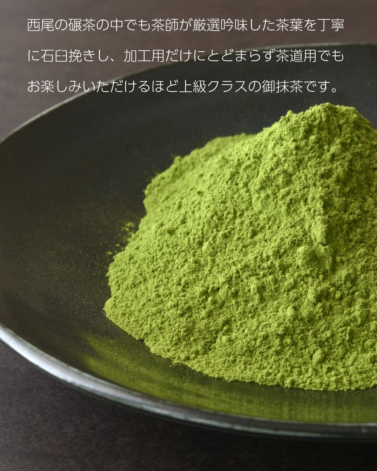 西尾産の抹茶は渋みが少なく、まろやかで強い旨味が特徴で、特にケーキ、パン、アイスクリームやドリンク系などにおすすめです。