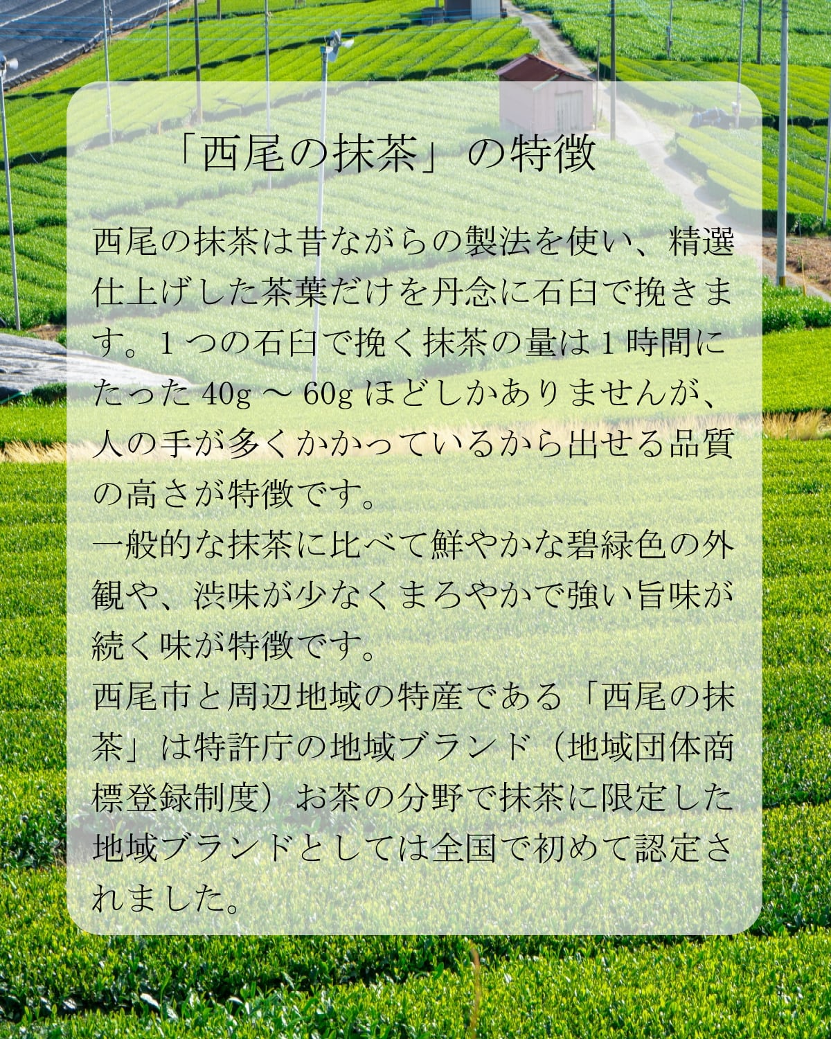 西尾の碾茶を丁寧に石臼挽きし、香り高く仕上げた抹茶です。石臼挽き特有の鼻に抜ける抹茶の香りやバランスの良い旨味を楽しんでいただけます。